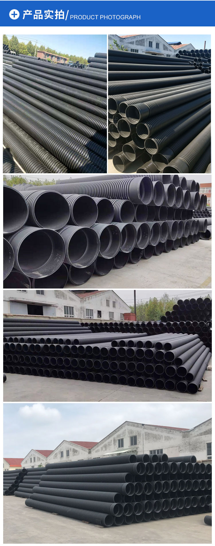 HDPE雙壁波紋管是以HDPE為主要原材料的復(fù)合型管材。廣泛應(yīng)用于市政、小區(qū)、工業(yè)雨污水排放、電力通信護(hù)套、農(nóng)田灌溉等。